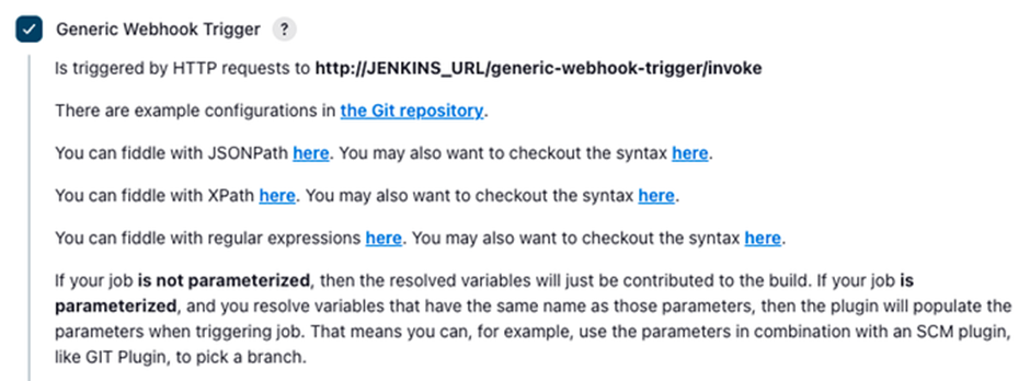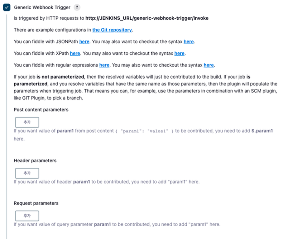 "http://JENKINS_URL/generic-webhook-trigger/invoke" 로 오는 요청에 대해 트리거가 수행된다는 말이 적혀져 있다.