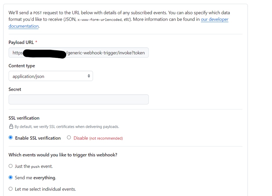 Payload URL을 위에서 확인한 Generic Webhook Trigger의 설정에 맞게 작성한다.