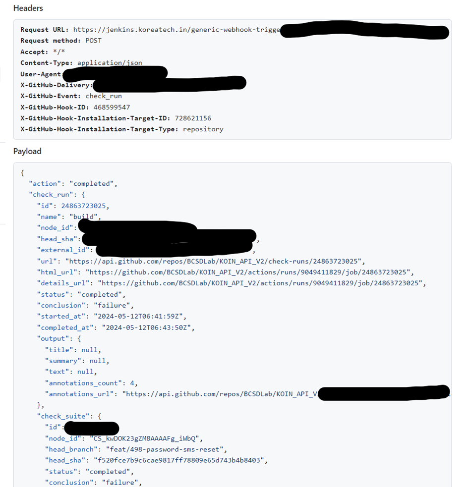 Github의 Webhook탭의 Recent Deliveries 탭으로 가서 확인해보면 Response Body값에 다음과 같은 응답이 담겨있는 것을 확인할 수 있다.
