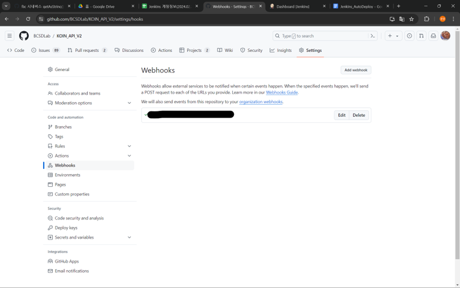 프로젝트 레포지토리 ->Settings-> Webhook탭에 들어와서 웹훅을 새로 만들어보자.