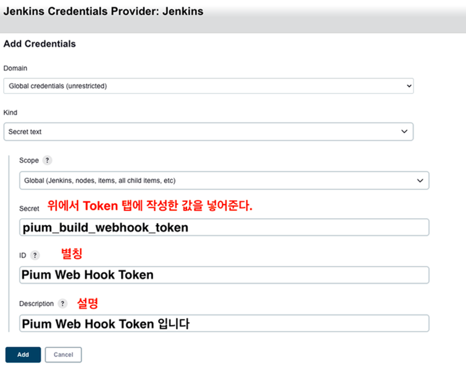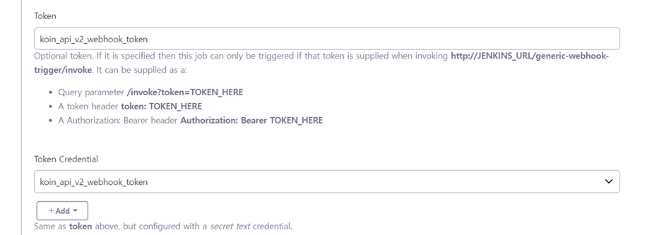 외부에서 빌드를 유발하기 위해서는 token을 확인하는 방식이 존재하는데, 이 때 Jenkins의 Credential에 있는 정보를 기반으로 수행한다.