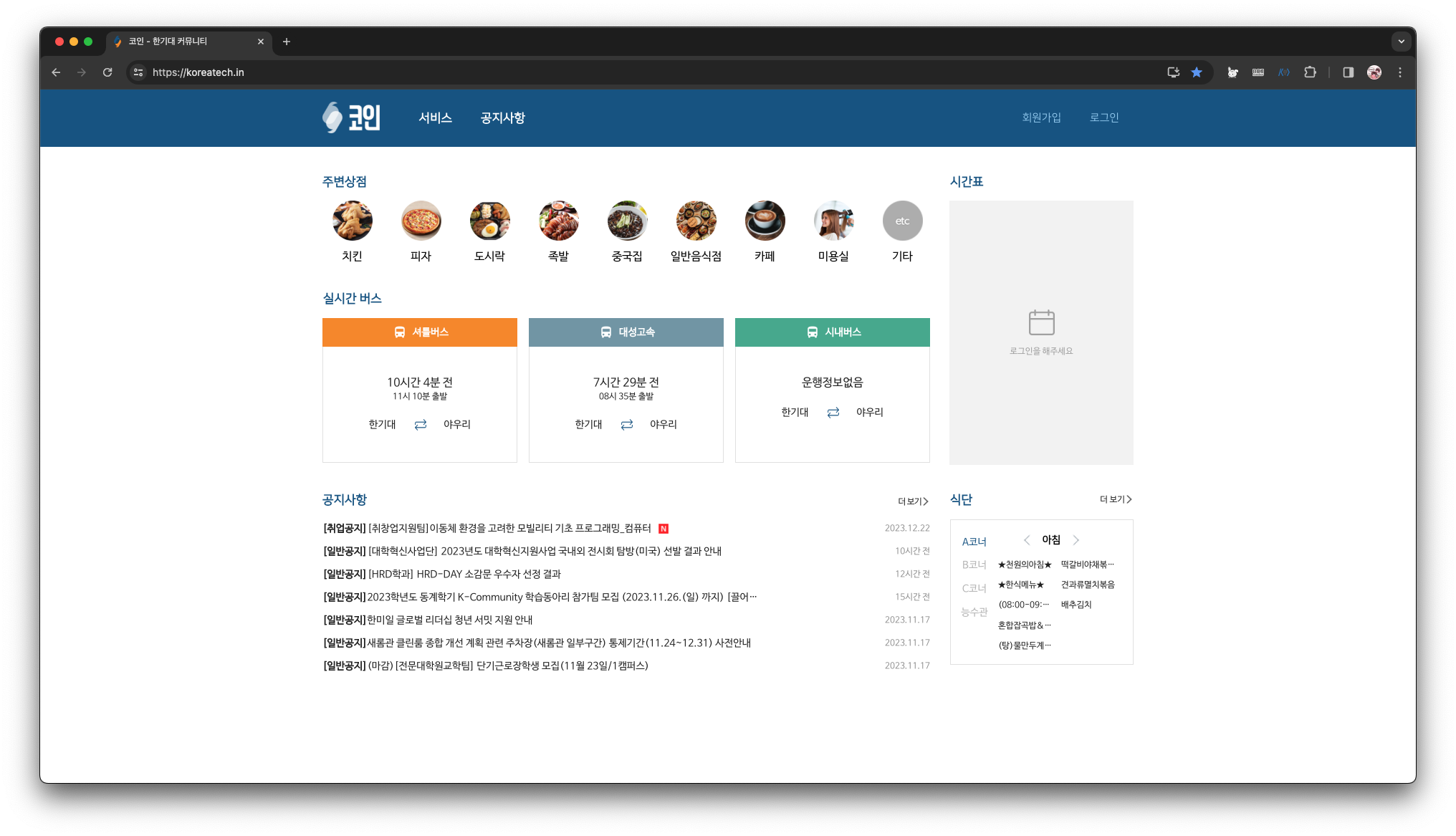 KOIN은 현재 한국기술교육대의 레퍼런스가 된 서비스인데, 학교의 위치적 문제로 인해 인근상점,버스,시간표 등의 정보를 재학생들에게 제공하고 있다.
