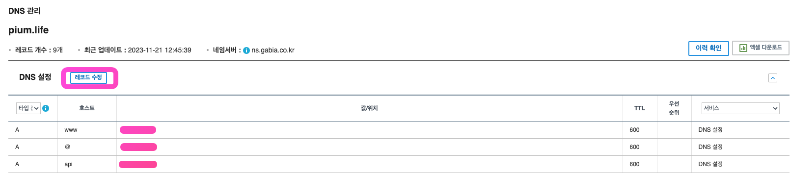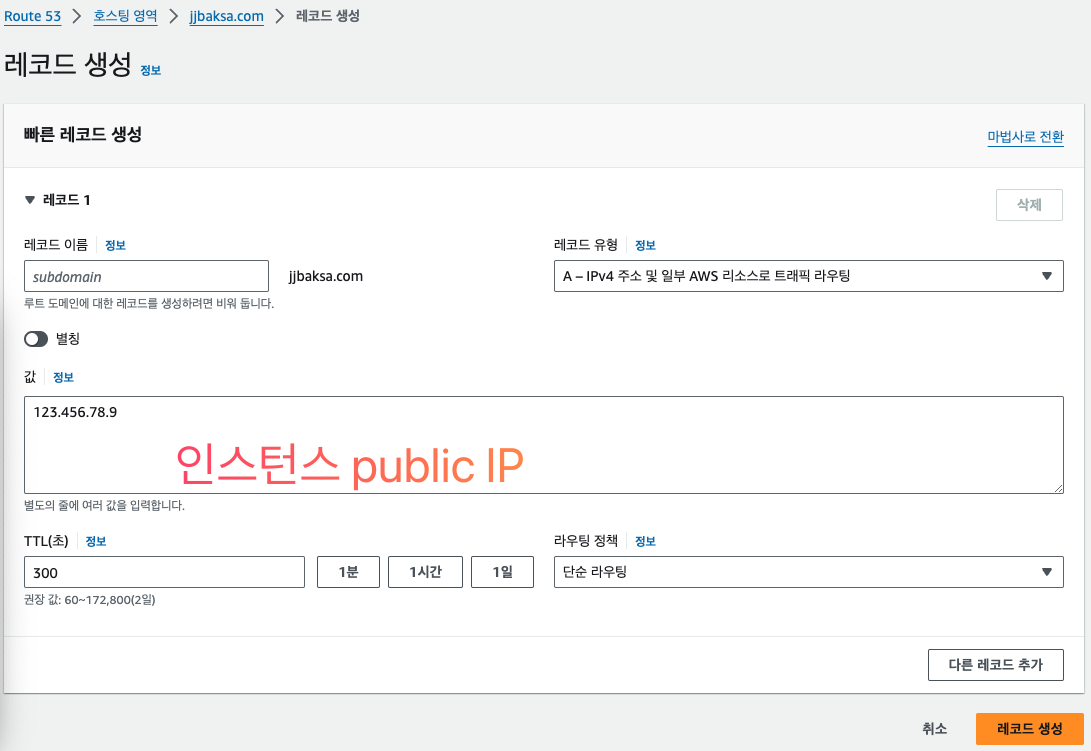 도메인의 A레코드를 생성한다. 이때 대상값을 Ec2의 퍼블릭IP(탄력적IP)로 향하게 구성하면 된다.