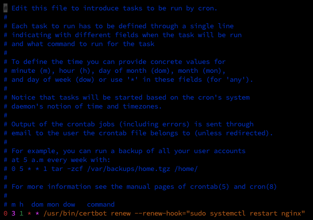 0 3 1 * * /usr/bin/certbot renew --renew-hook="sudo systemctl restart nginx"