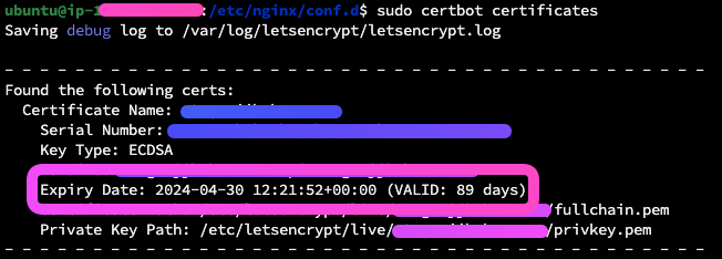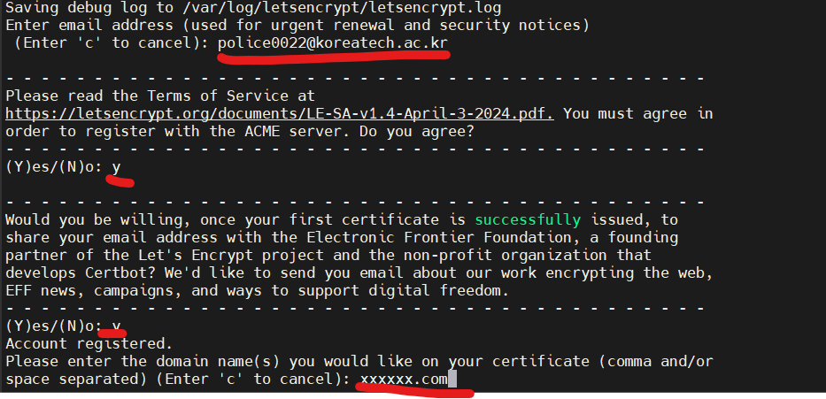 우리가 nginx에 선언해둔 server_name에 대한 인증서 발급을 수행한다고 설명하고 있다.