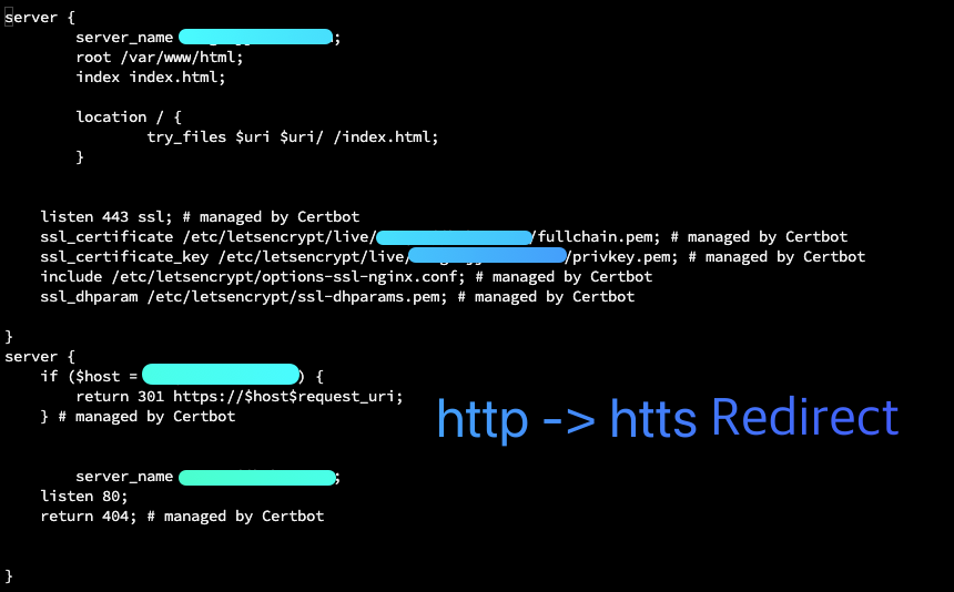 발급이 완료되면 작성했던 파일에 cerbot이 SSl인증서를 적용하는 코드와 http->https리다이렉트 하는 코드를 적용한 모습을 볼 수 있다.(만약 처음 nginx를 작업한다면 aws보안그룹에서 443포트도 개방을 해줘야 한다.)