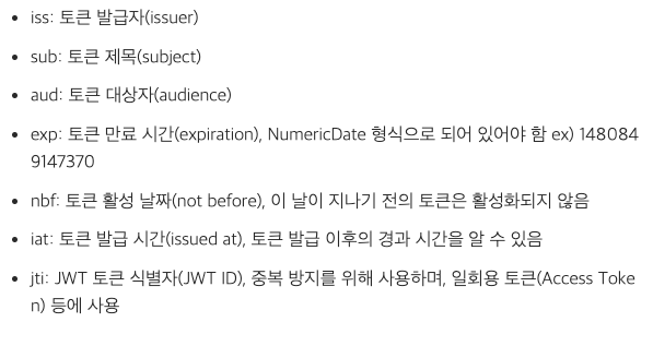 등록된 클레임은 토큰 정보를 표현하기 위해 이미 정해진 종류의 데이터들로, 모두 선택적으로 작성이 가능하며 사용할 것을 권장한다. 또한 JWT를 간결하게 하기 위해 Key는 모두 길이 3의 String이다. 여기서 subject로는 unique한 값을 사용하는데, 사용자 이메일을 주로 사용한다.