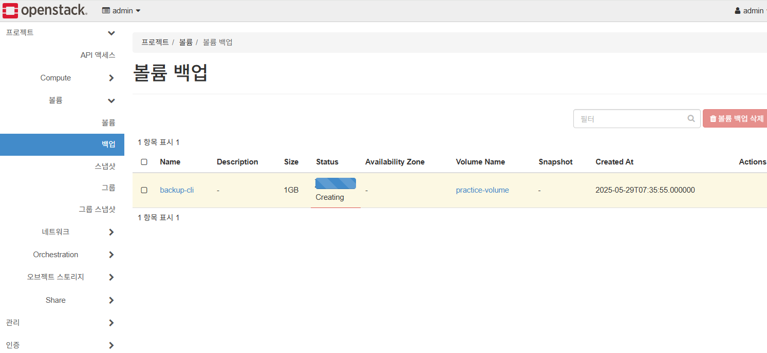 볼륨 백업 생성 : openstack volume backup create --name backup-cli practice-volume --force