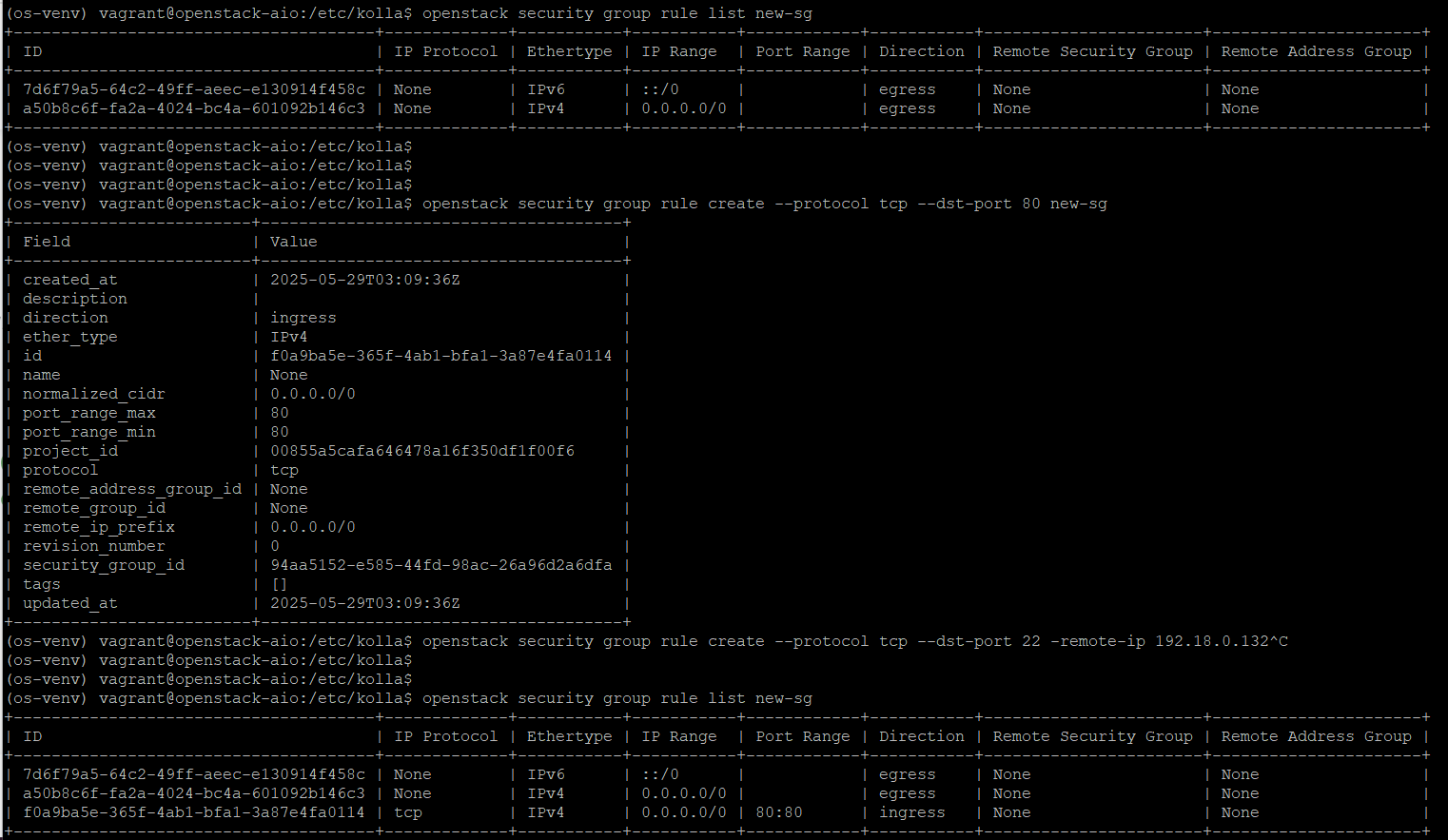(os-venv) vagrant@openstack-aio:/etc/kolla$ openstack security group rule create --protocol tcp --dst-port 2 --remote-ip 0.0.0.0/0 new-sg ^C