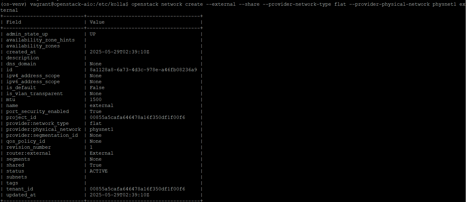(os-venv) vagrant@openstack-aio:/etc/kolla$ openstack network create --external --share --provider-network-type flat --provider-physical-network physnet1 external