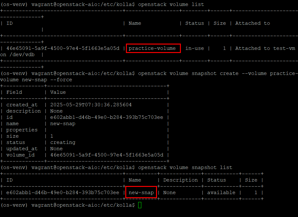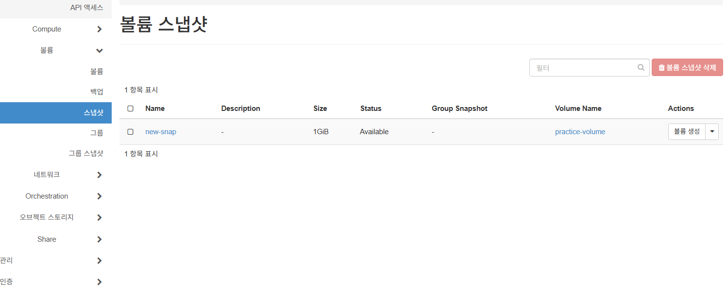 볼륨 스냅샷 생성: openstack volume snapshot create --volume practice-volume new-snap --force