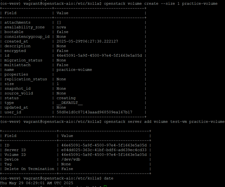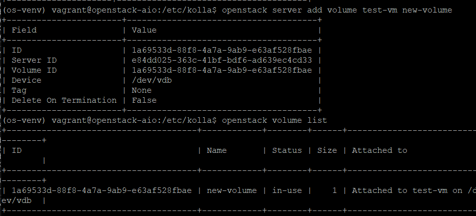 (os-venv) vagrant@openstack-aio:/etc/kolla$ openstack server remove volume test-vm new-volume