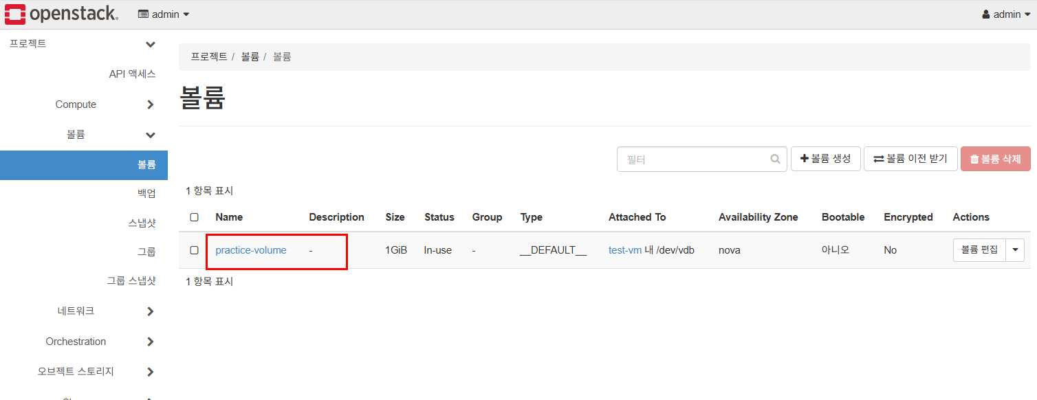 - 1G 크기의 볼륨을 생성, 이름:practice-volume