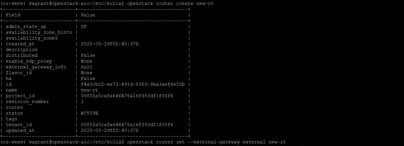 (os-venv) vagrant@openstack-aio:/etc/kolla$ openstack router set --external-gateway external new-rt