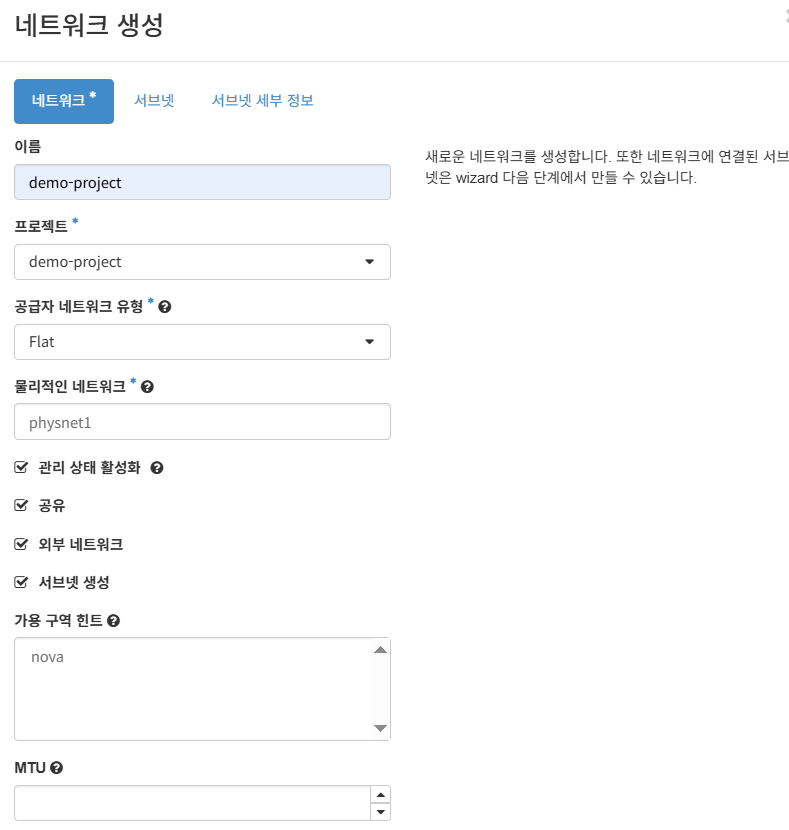 flat: VLAN 없이 하나의 물리 네트워크를 모든 인스턴스가 공유함. 네트워크 격리 불가.