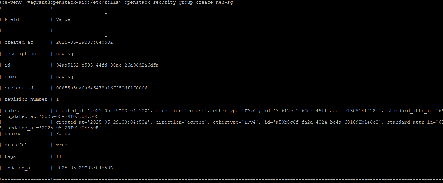 (os-venv) vagrant@openstack-aio:/etc/kolla$ openstack security group create new -sg ^C
