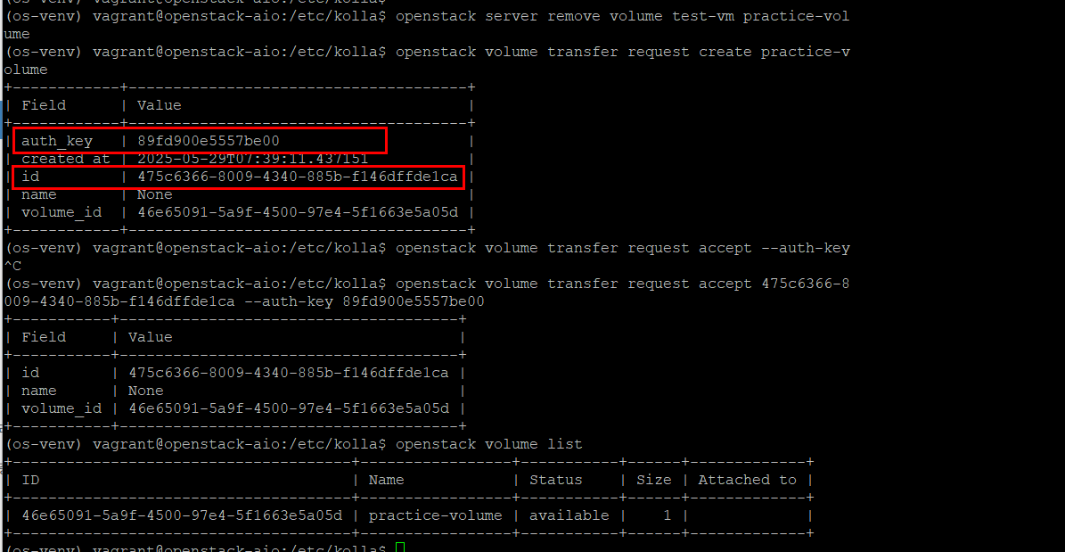 transfer 수락: openstack volume transfer request accept <transfer-request-id> --auth-key <auth-key>