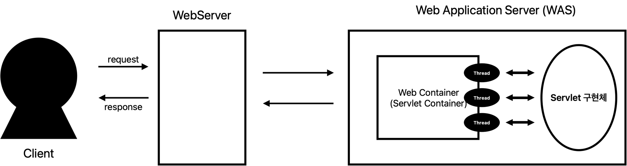 Client가 동적 컨텐츠를 요청할 시 Web Container는 각 요청마다 Thread를 생성하고 Servlet을 실행시킨다.