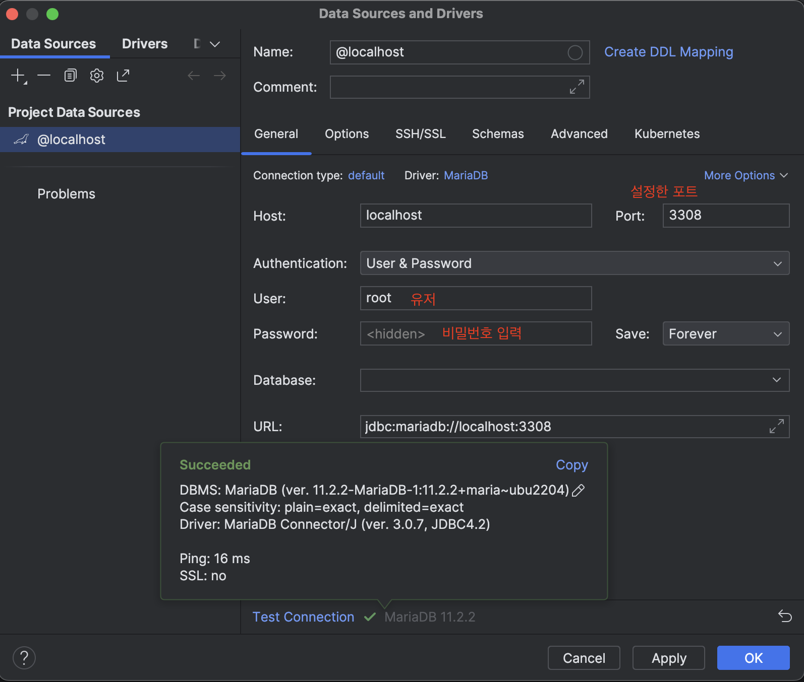 driver-class-name: org.mariadb.jdbc.Driver3306:3306으로 설정하였다면 이대로 하면 되지만 만약 나처럼 포트를 변경하였다면이렇게 하면 spring boot 와 mariadb가 연동이 되었다