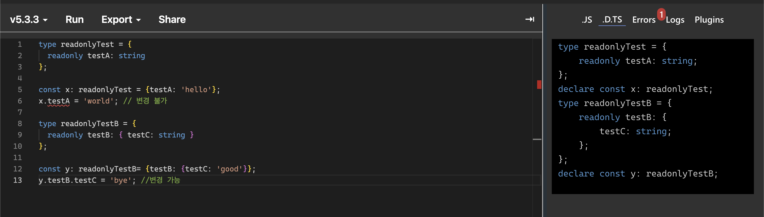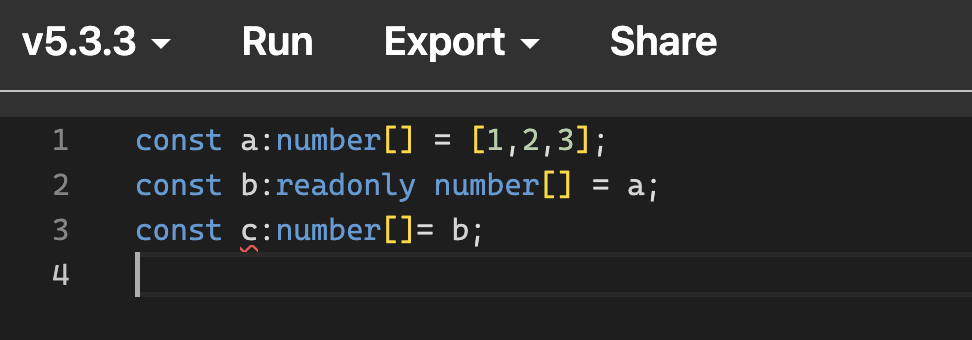readonly배열에 할당할 수 있다. 하지만 그 반대는 불가능하다.