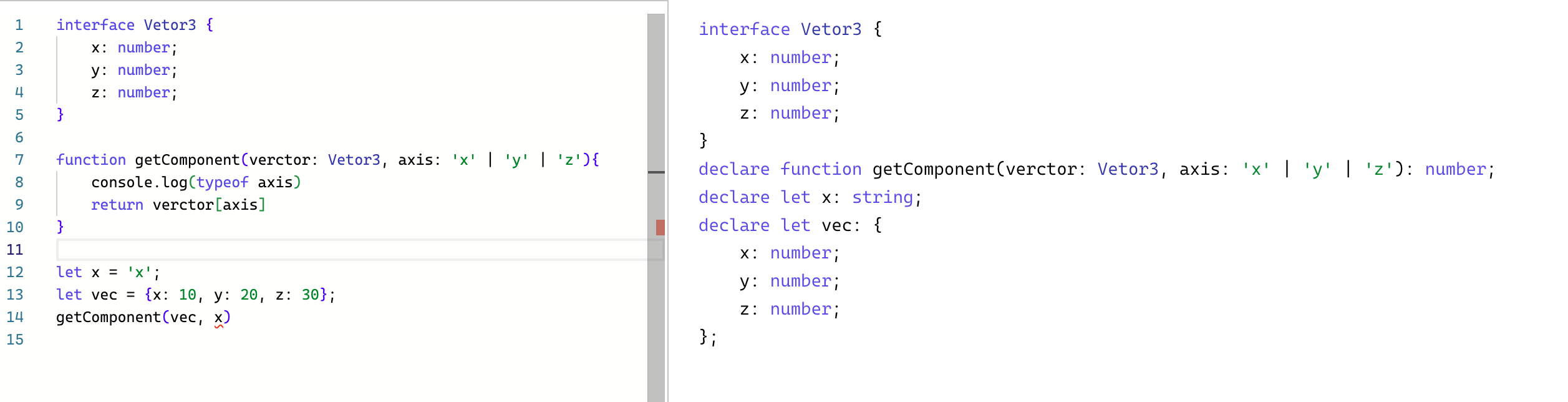 getComponent 함수는 두 번째 매개 변수에 "x" | "y" | "Z" 타입을 기대했지만, x 타입은 할당 시점에 넓히기가 동작해서 string으로 추론 되었다. string 타입은 "x"|"y"|"z" 타입에 할당이 불가능하므로 오류가 된 것이다.
