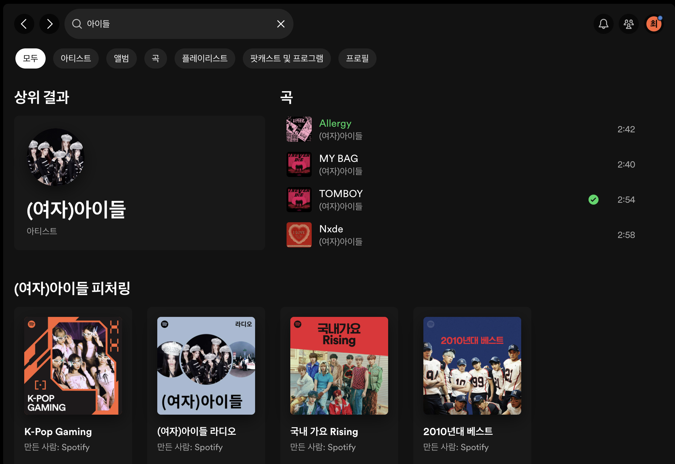 Spotify에서 아래와 같이 키워드를 통해 검색하면 아티스트, 앨범, 곡 등 다양한 데이터에 대한 결과를 노출한다.