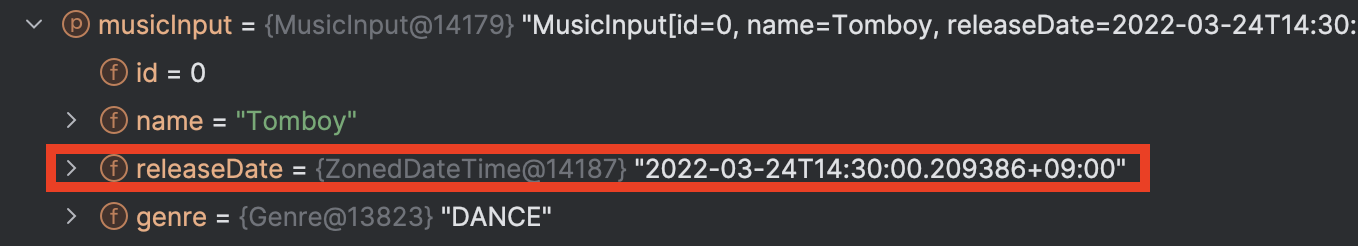 Controller 에서 디버깅을 해본 결과 releaseDate 에 전달한 문자열이 정상적으로 ZonedDateTime 타입으로 파싱되었음을 확인 할 수 있었다.