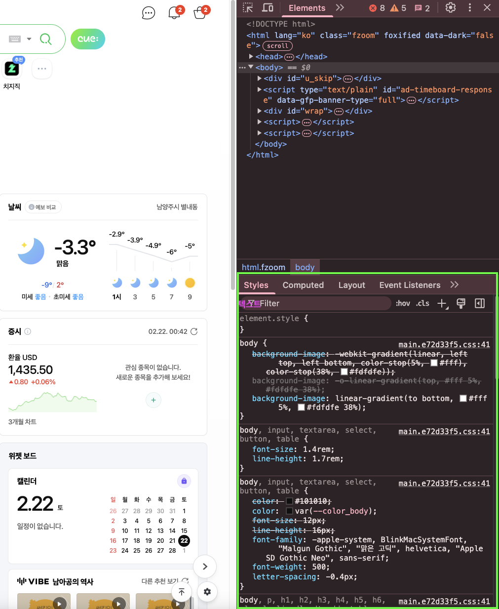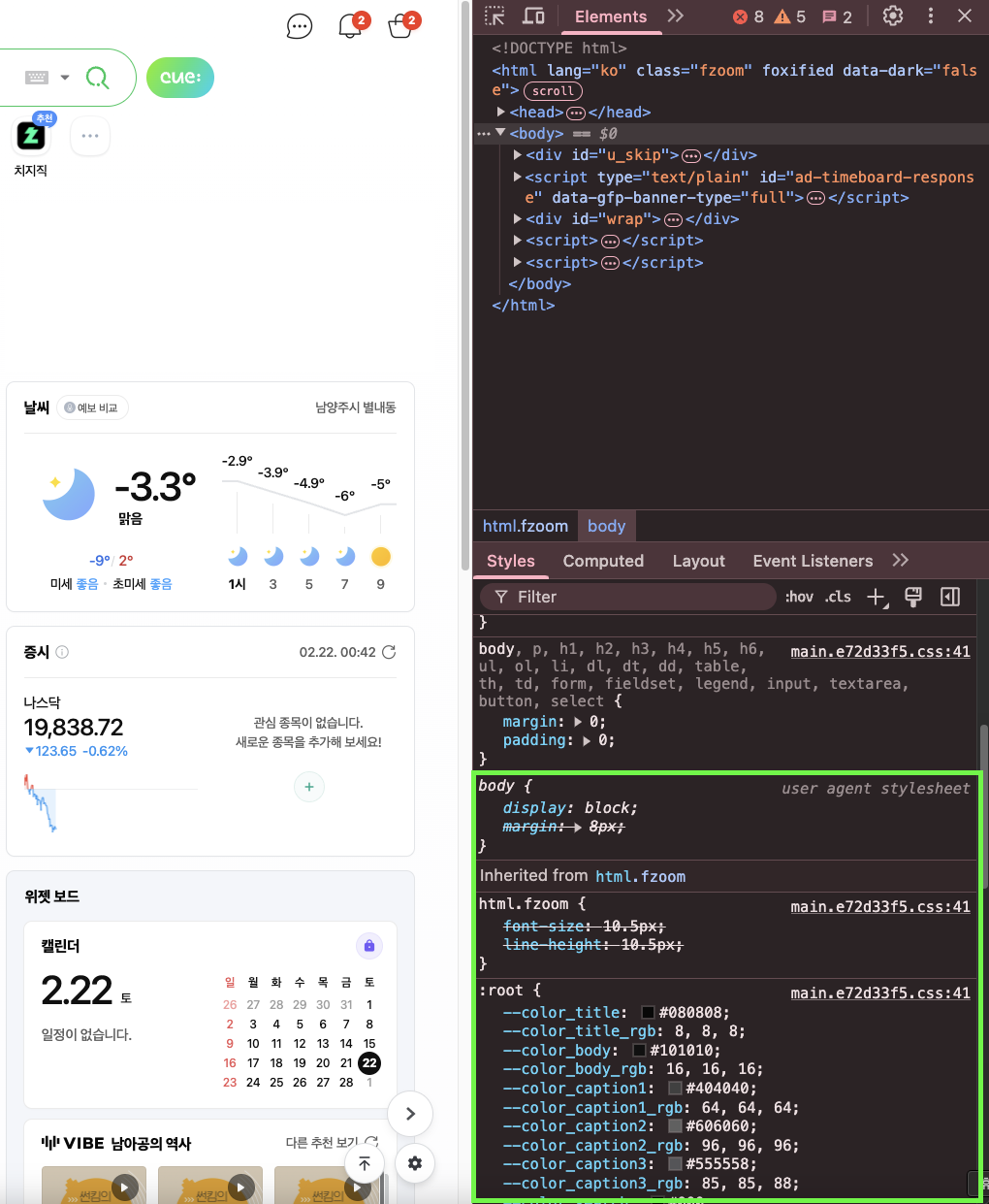 네이버 홈페이지에서 개발자 도구(F12)를 열어서 Styles 검사를 해보면 다음과 같은 화면을 볼 수 있다.