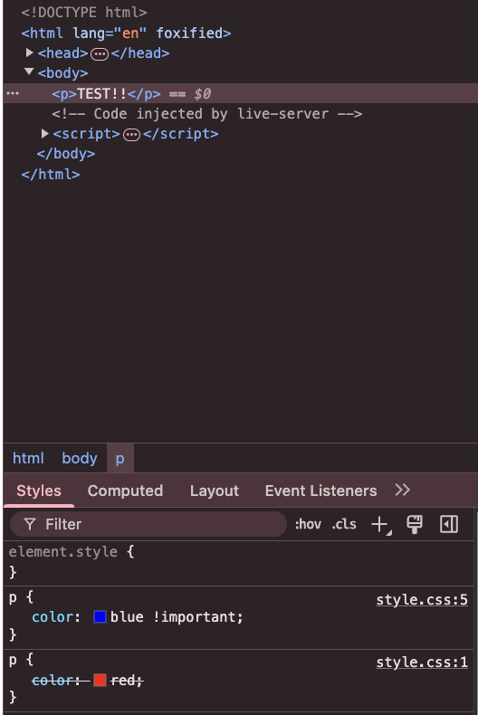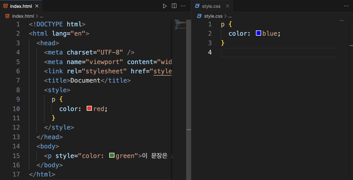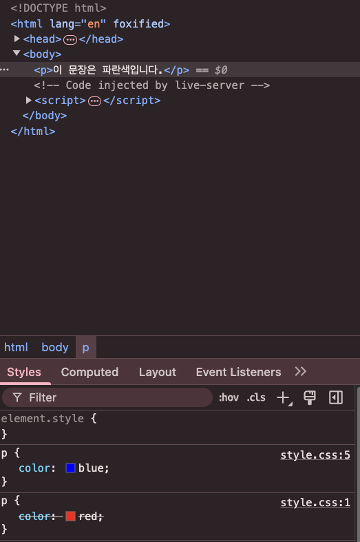 아래 코드에서 두 개의 p 요소 스타일이 동일한 명시도를 가지지만 나중에 선언된 스타일이 우선 적용되므로, 최종적으로 color: blue;가 적용된다.