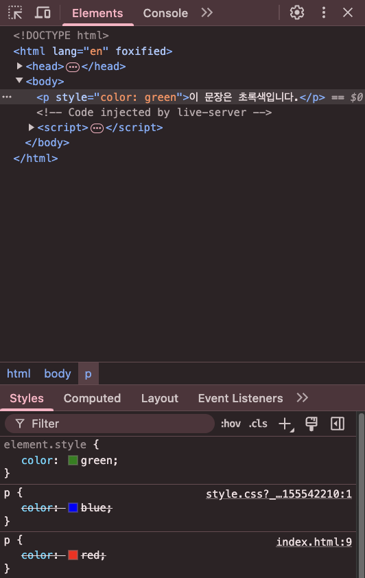 외부 스타일시트, 내부 스타일시트, 인라인 스타일 중 인라인 스타일이 최종적으로 적용된 모습을 확인할 수 있다.