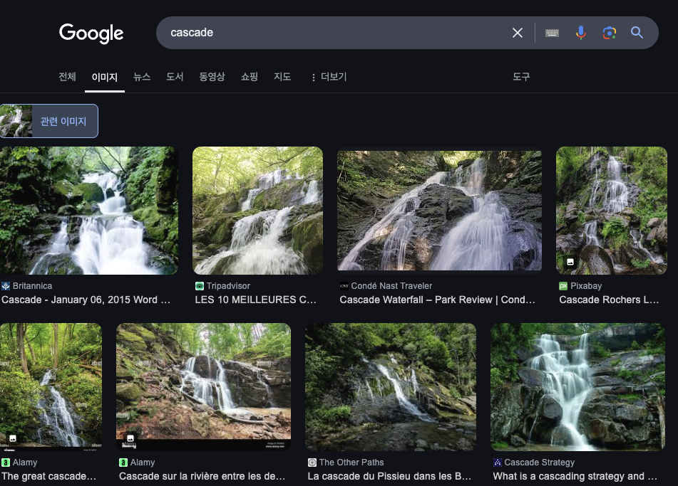 'Cascade(이하 케스케이드)'를 구글에 검색하면 다음과 같이 계단식의 폭포, 분수 사진이 나타난다.