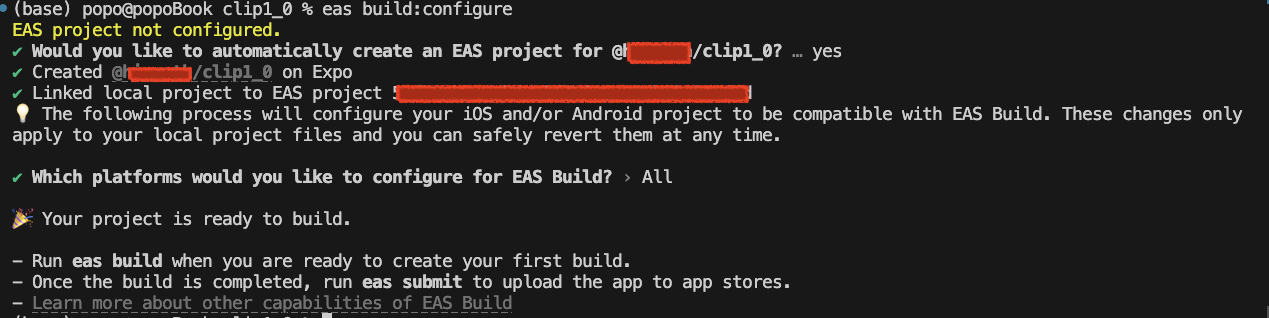 ✔ Would you like to automatically create an EAS project for @/clip1.0? … yes