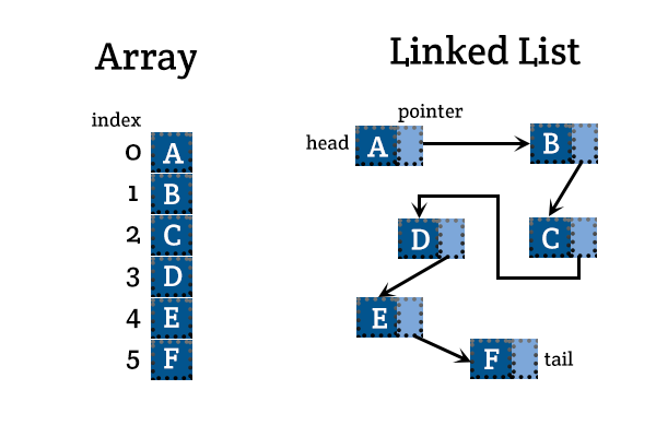 NULL 값이 아닌 노드의 주소를 대입함으로써 원형의 구조를 가져 삽입과 삭제를 용이하게 할 수 있다. 또 다른 리스트 자료구조인 Array(배열)은 연속된 메모리 공간에 할당된 리스트이다.
