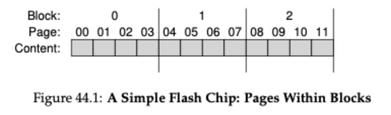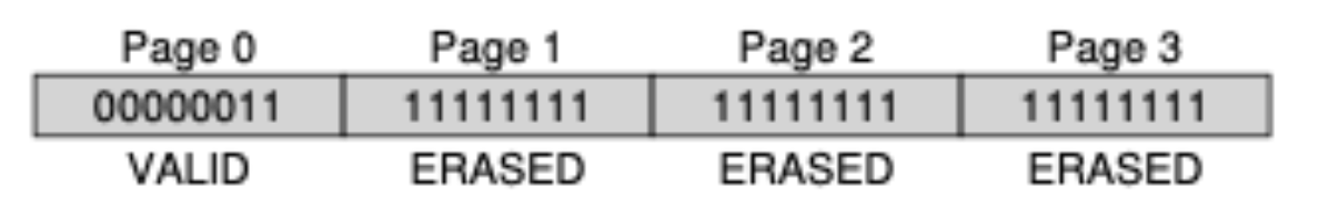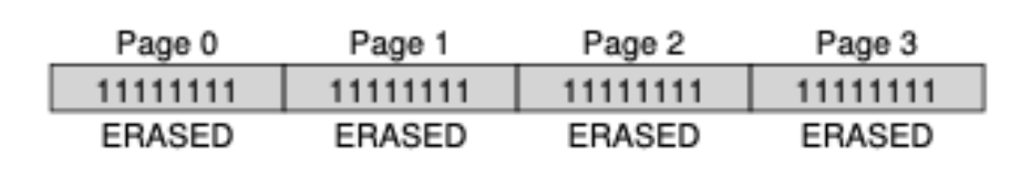 - 기존에는 덮어쓰면 그만이었는데 이제는 해당 페이지가 속한 블록을 모두 삭제해야 하는 비효율적인 방법으로 진행됩니다. 그럼 간단하게 블록의 크기가 4페이지이고 페이지의 크기는 8비트인 플래시 칩으로 명령들이 어떻게 수행되는지 살펴보겠습니다.