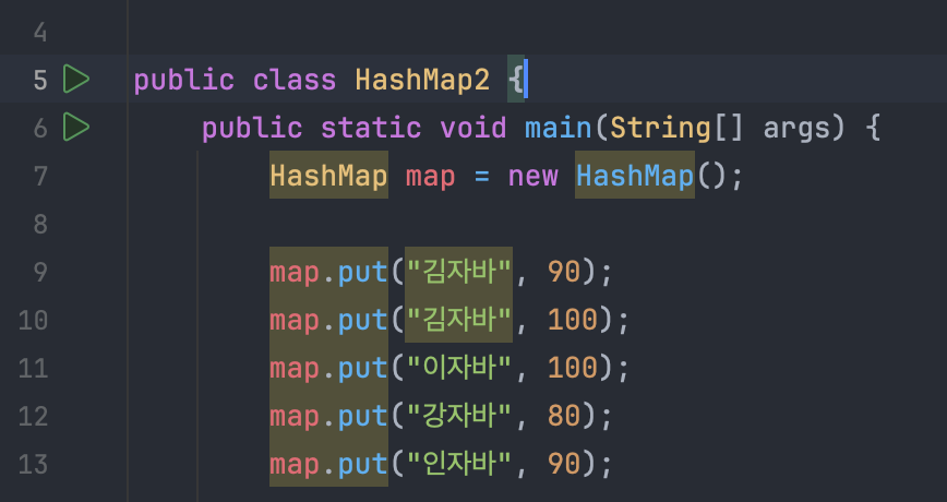 아래는 HashMap을 사용하여 데이터를 저장하는 코드이다.
