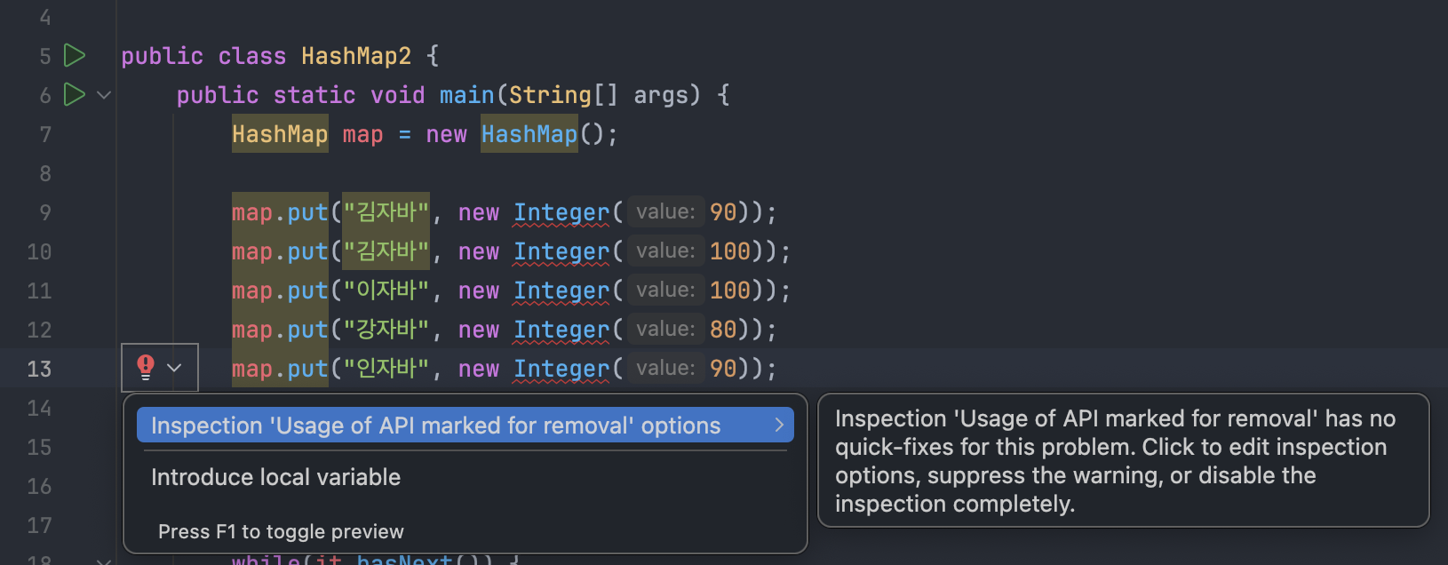 코드실행 자체는 문제없이 되지만 불쾌한 빨간전구.. 우리의 똑똑한 IntelliJ가 좋지않은 코드라고 수정해달라는 신호이다.