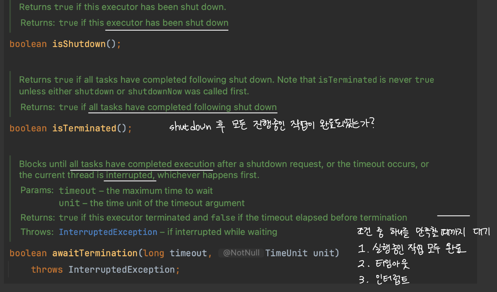 shutdown을 호출한 스레드는 실행 중인 작업이 종료될 때까지 기다리지 않고 바로 다음 라인을 실행합니다. 만약 스레드가 작업이 종료될 때까지 기다리길 원한다면 awaitTermination을 사용해야 합니다.