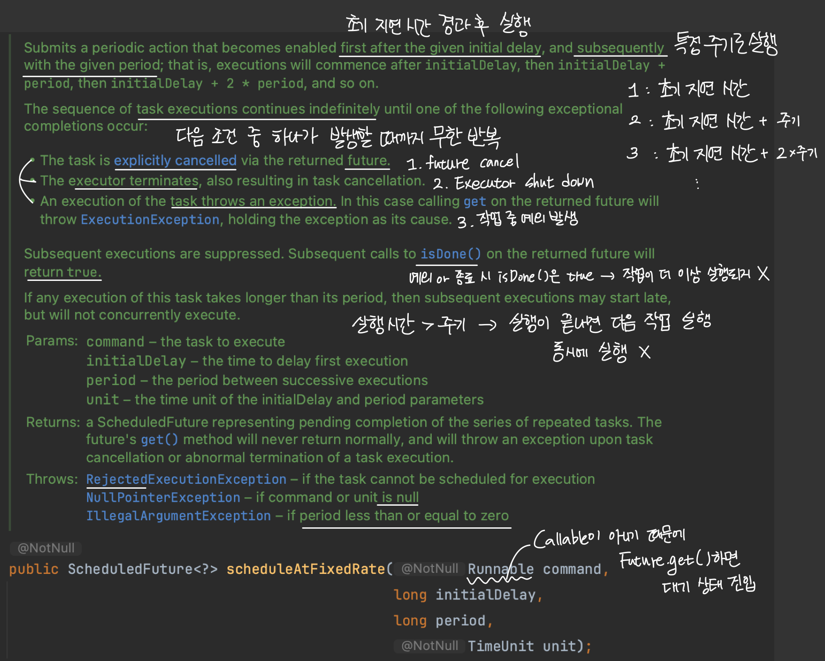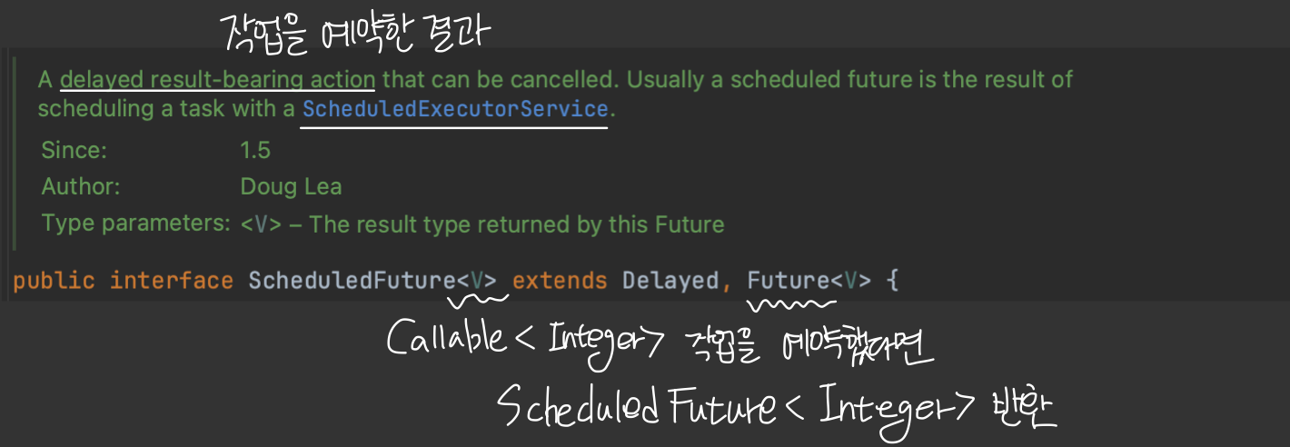 ScheduledFuture는 주로 지연이나 주기적인 작업 실행을 위한 것으로 getDelay(TimeUnit unit)으로 작업이 실행 되기까지 남은 지연 시간을 반환받을 수 있습니다.