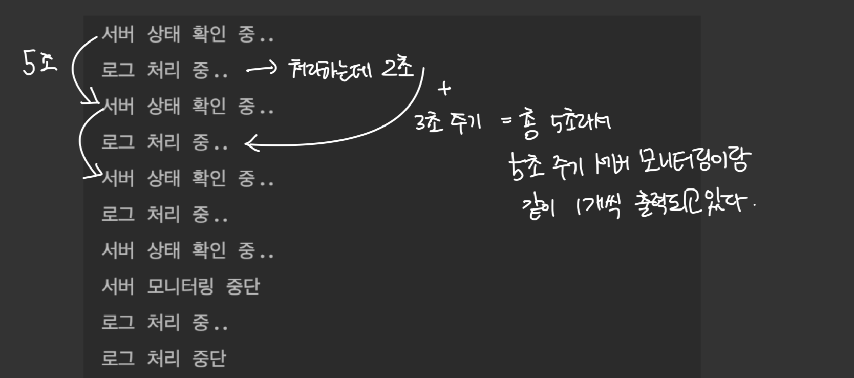// 2. 백그라운드 로그 처리 (이전 로그 처리 후(2초 소요) 3초 주기로)