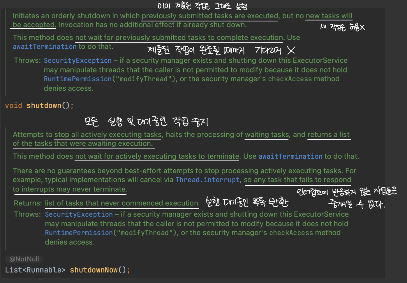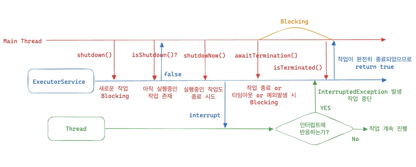 ExecutorSevice는 스레드 풀을 종료하기 위해 2가지 메서드를 제공합니다.