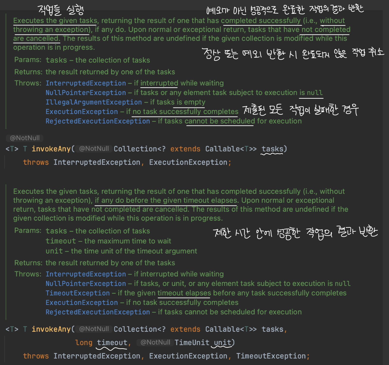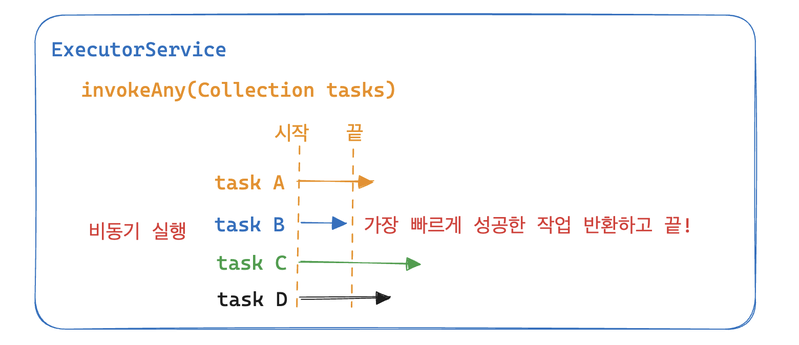invokeAny()는 여러 개의 Callable 작업을 비동기적으로 동시에 실행한 뒤 그 중 가장 빠르게 성공적으로 완료한 작업의 결과를 반환합니다. 이때는 예외가 발생한 경우를 성공적인 완료라고 보지 않습니다.
