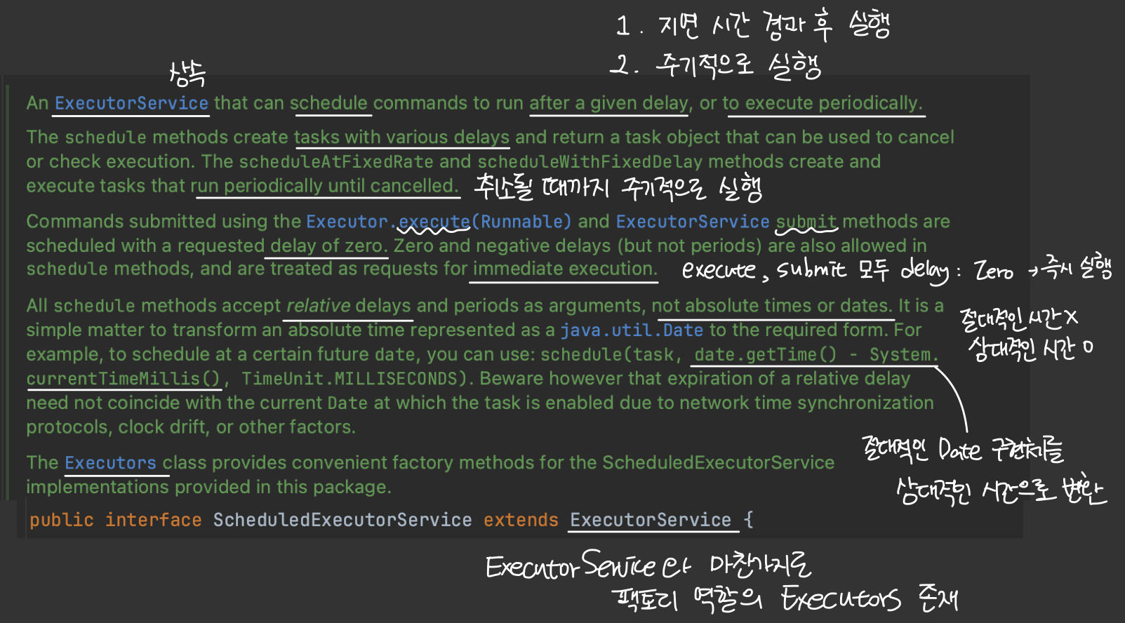ScheduledExecutorService는 주어진 지연 시간 후에 작업을 실행하거나 특정한 주기를 가지고 작업을 반복적으로 실행할 수 있는 인터페이스입니다.