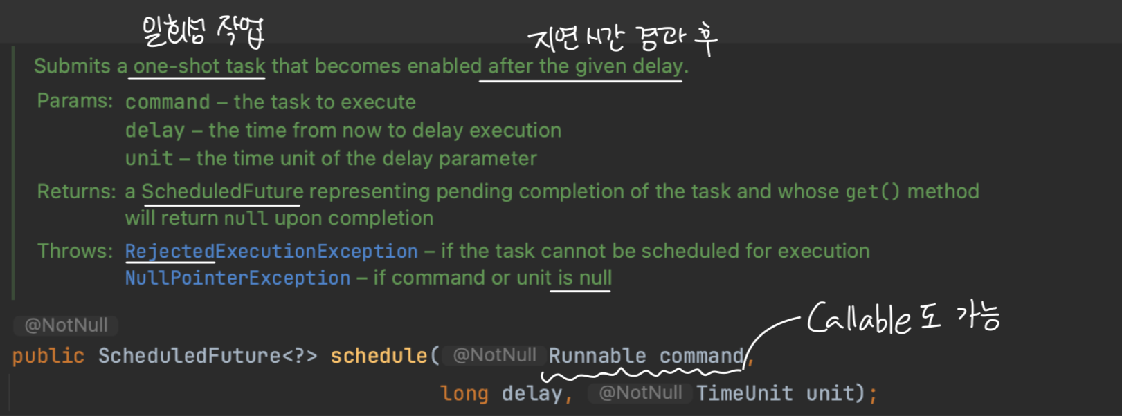 schedule()은 주어진 지연 시간 이후에 Runnable이나 Callable로 전달된 작업을 예약하고, ScheduledFuture를 즉시 반환합니다. 지연 시간이 경과하면 주어진 작업이 딱 한 번 실행됩니다.