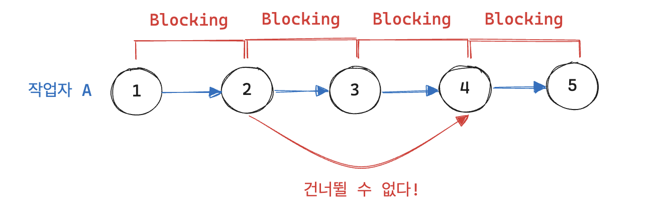 따라서 다음 작업은 실행중인 작업의 결과에 관심을 가지고 끝나기를 기다립니다. 즉, 작업이 완료될 때까지 실행 흐름을 멈추는 Blocking 특성을 가집니다.