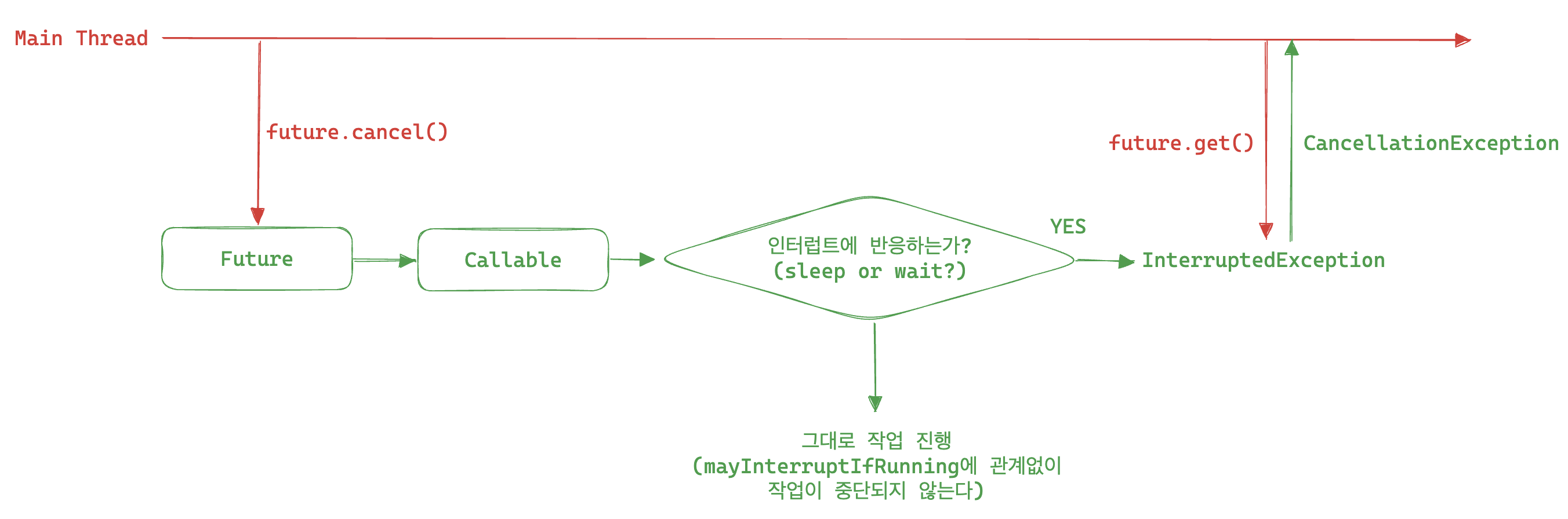 mayInterruptIfRunning이 true더라도 Callable에서 실행하는 작업이 인터럽트에 반응하지 않는다면, 즉 sleep이나 wait 작업이 없다면 작업이 중단되지 않고 계속 진행합니다.