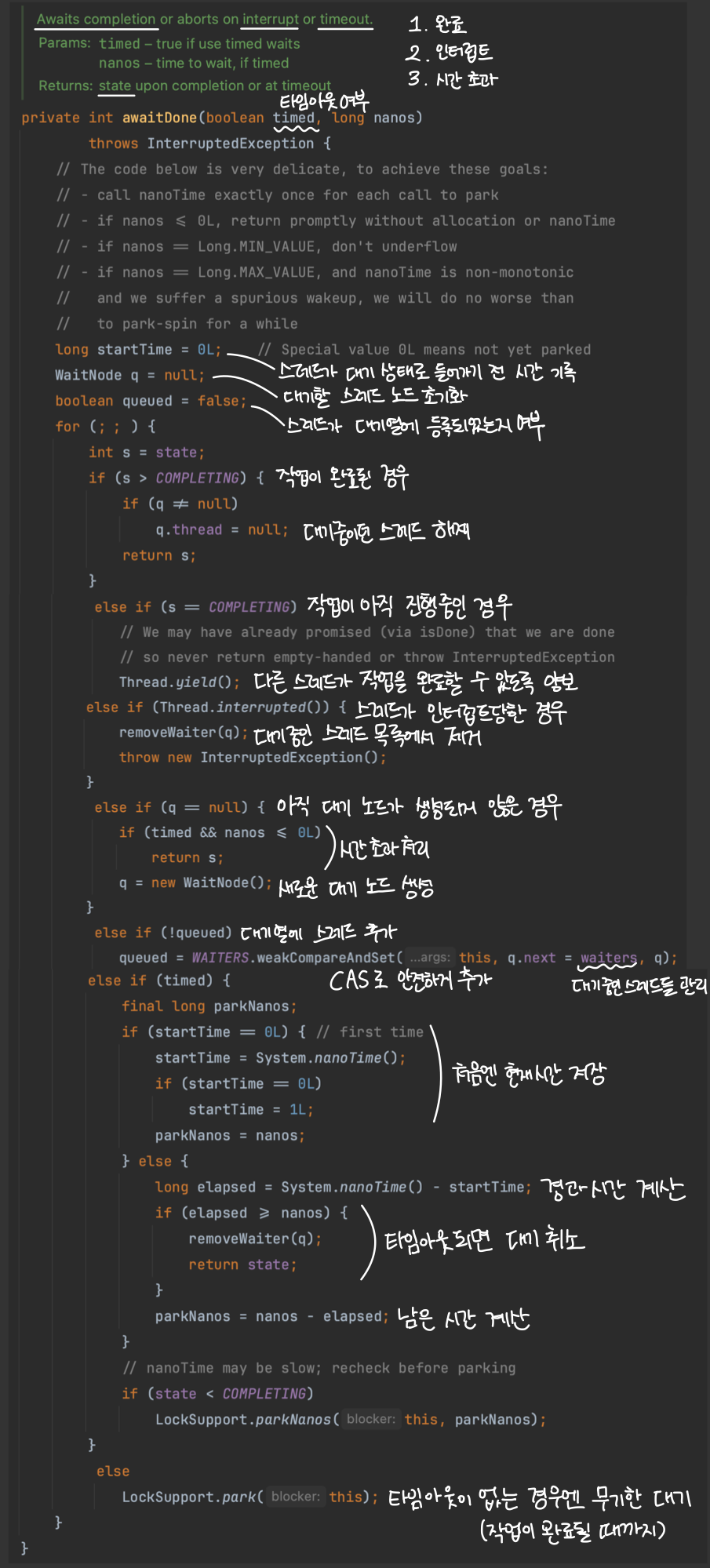 결국 awaitDone()을 통해 3가지 상태 중 하나일 때까지 스레드를 대기시키는 것입니다.