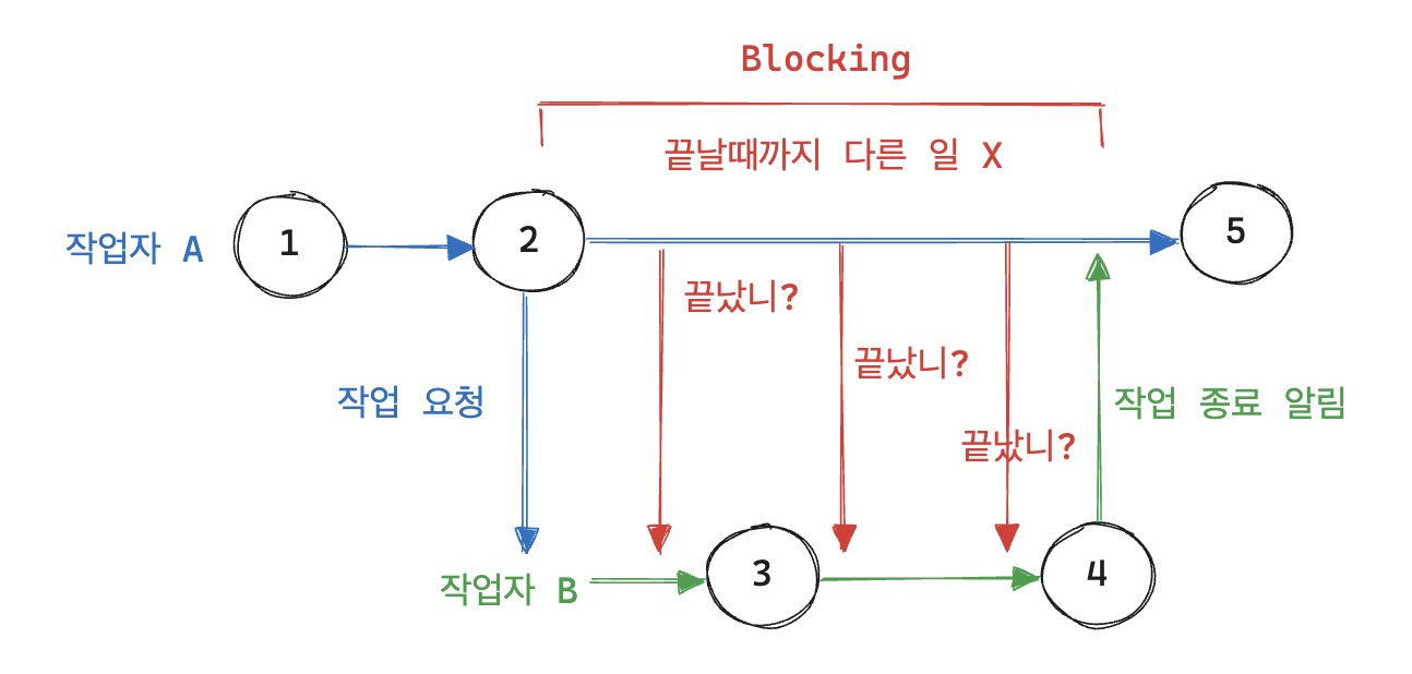 비동기로 작업을 요청해두고, 그 작업 결과에 관심을 가지는 경우 작업의 결과를 기다리는 동안 대기하는 동기(Blocking) 상황이 발생할 수 있습니다.