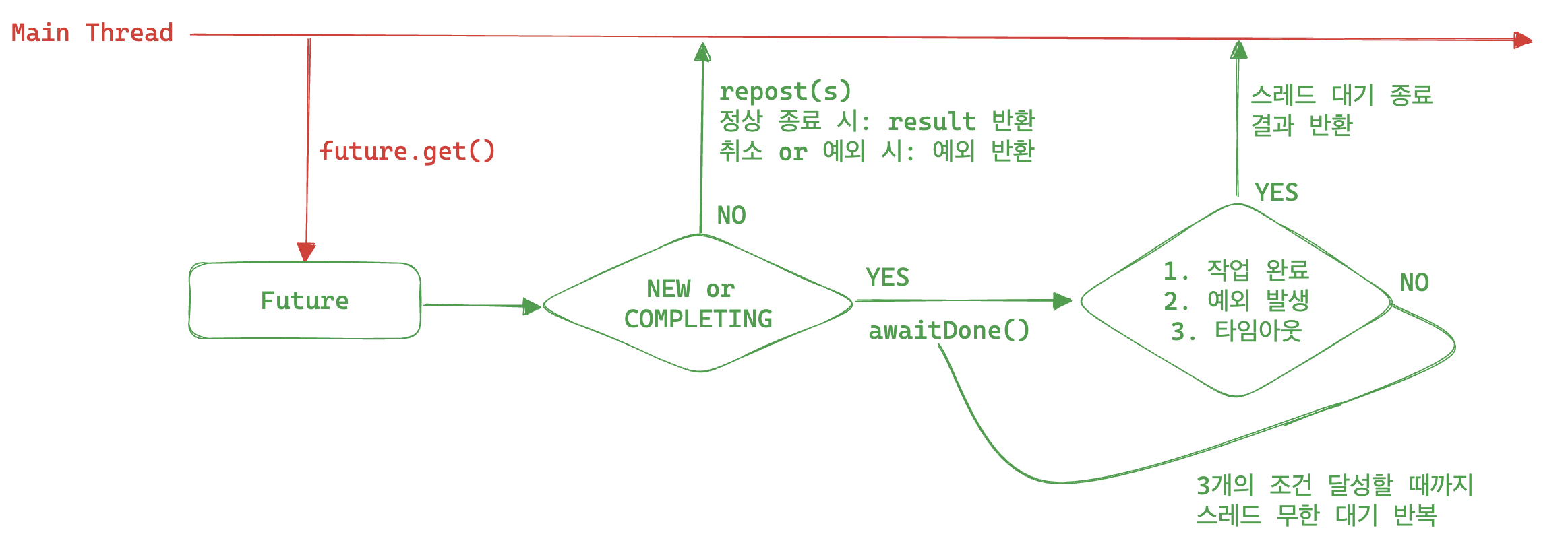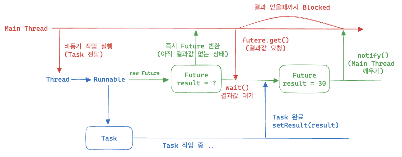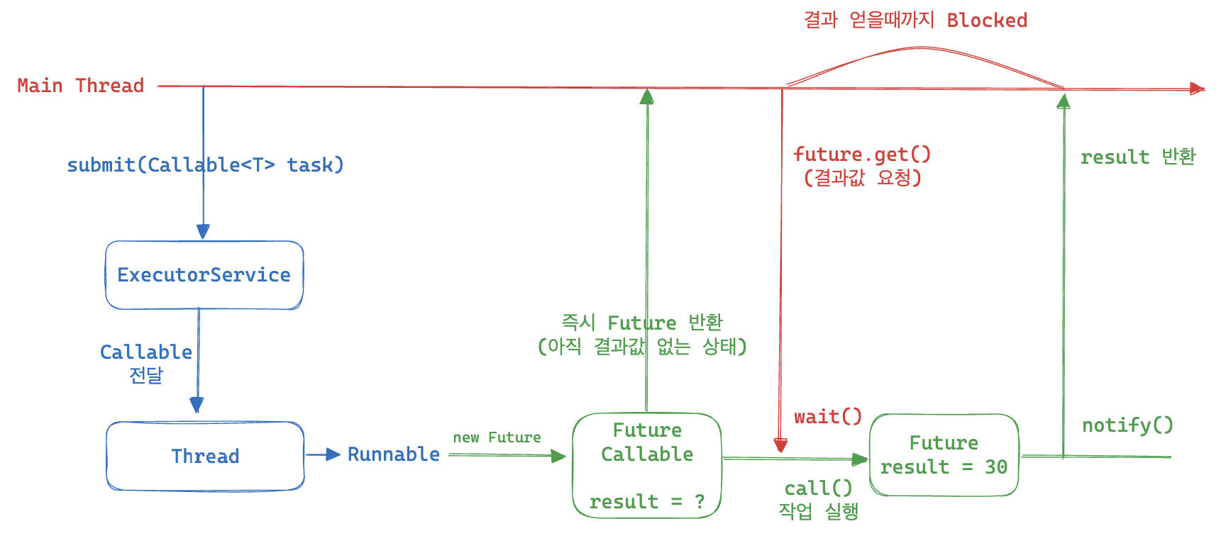 submit()을 통해 Callable 인터페이스를 통해 결과를 반환하는 task를 실행합니다. 그 후 Future의 get()을 사용하면 비동기 작업이 완료될 때까지 메인 스레드는 블로킹된 후 결과를 얻습니다.