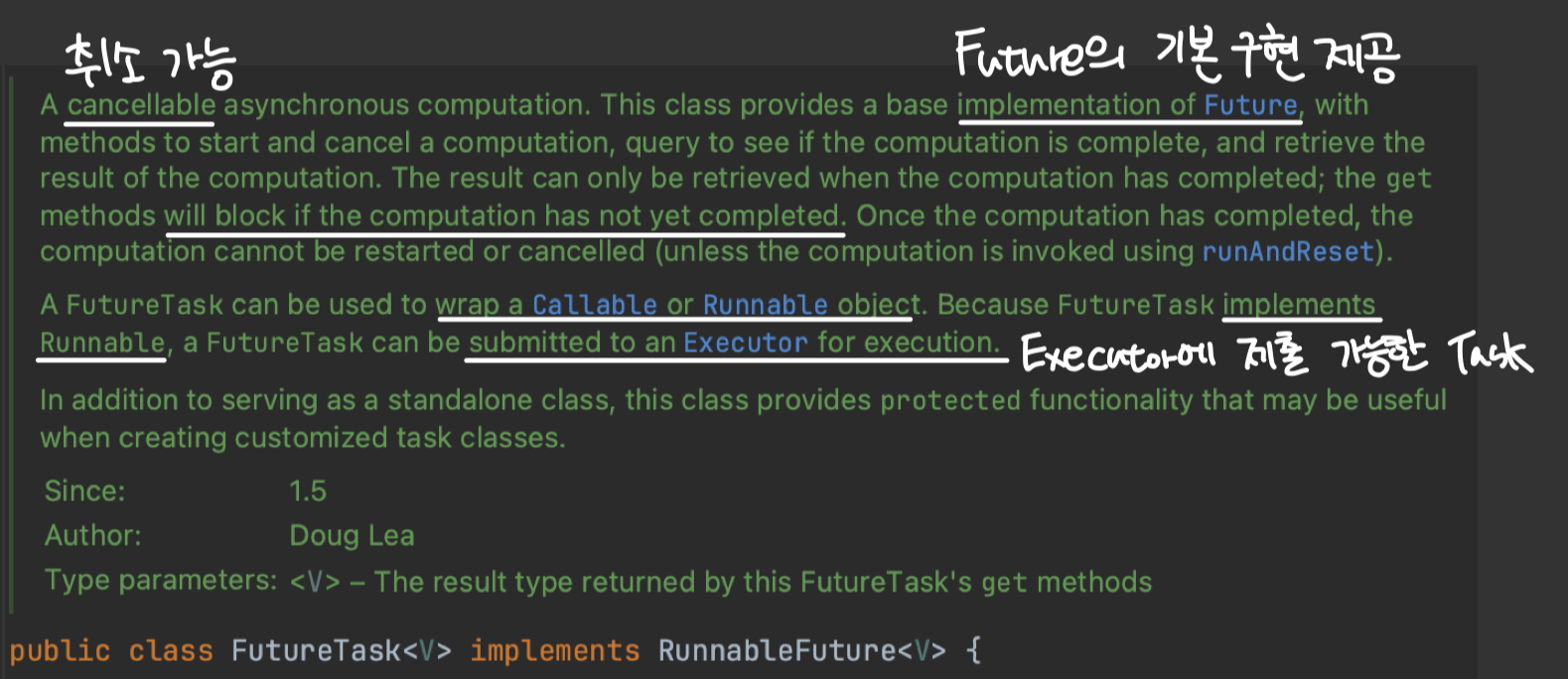 즉, FutureTask로 Callable을 실행할 수 있을 뿐만 아니라, 그 결과를 안전하게 저장하고 나중에 가져올 수 있도록 해줍니다.