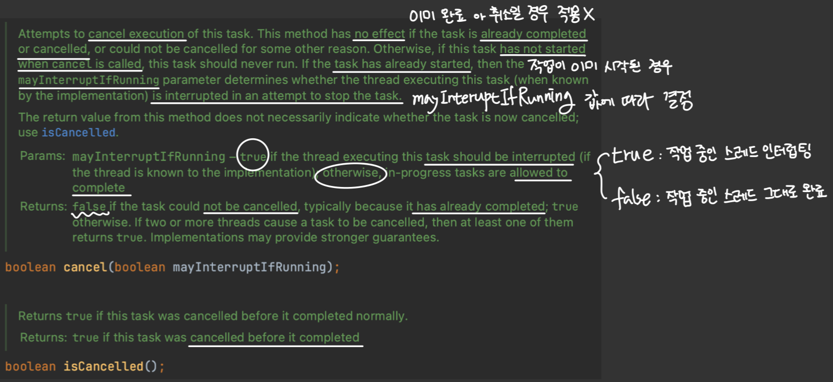또한, cancel()은 작업이 현재 취소되었는지 여부를 반드시 나타내지는 않기 때문에 정확한 취소 여부는 isCancelled()를 사용해야 합니다.